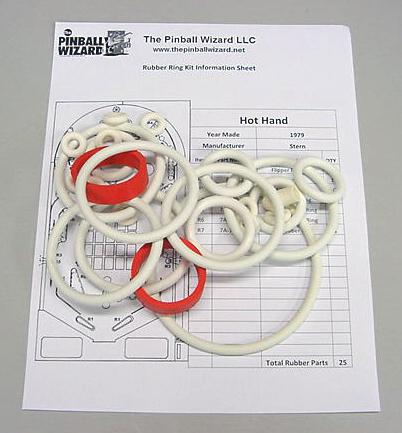 Rubber ring kit for a 1979 Stern Hot Hand Pinball machine This kit has a total of 25 rubber parts White rubber rings with red flipper rubbers are the factory original color Includes rubber ring sizing chart and playfield rubber location diagram