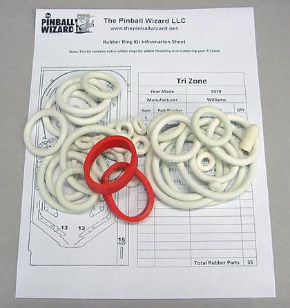 Rubber ring kit for a 1979 Williams Tri Zone pinball machineThis kit has a total of 35 rubber parts White rubber rings with red flipper rubbers are the factory original colorIncludes rubber ring sizing chart and playfield rubber location diagram