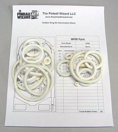 Rubber ring kit for a 1978 Stern Wild Fyre Pinball machineThis kit has a total of 26 rubber partsWhite rubber rings with White flipper rubbers are the factory original colorIncludes rubber ring sizing chart and playfield rubber location diagram