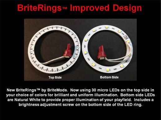 BriteRings use new and improved technology; now with 30 micro-LEDs on the top side to provide very uniform lighting. The bottom side uses 10 natural white LEDs to provide proper color and illumination of your playfield. Just choose a color and glue these LED rings into your existing or new pop bumper caps (select color from the drop-down menu above). BriteRings have fully adjustable brightness and LEDs last for years; using significantly less power and heat as compared to incandescent bulbs
