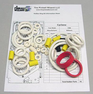 Rubber ring kit for a 1988 Williams Cyclone Pinball machineThis kit has a total of 48 rubber partsWhite rubber rings with red flipper rubbers are the factory original colorIncludes rubber ring sizing chart and playfield rubber location diagram