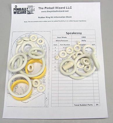 Rubber ring kit for a 1982 Bally Speak Easy pinball machineThis kit has a total of 34 rubber partsWhite rubber rings with yellow flipper rubbers are the factory original colorIncludes rubber ring sizing chart and playfield rubber location diagram