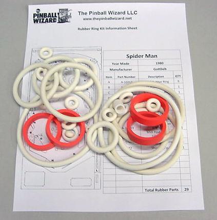 Rubber ring kit for a 1980 Gottlieb Spider Man pinball machineThis kit has a total of 29 rubber partsWhite rubber rings with red flipper rubbers are the factory original colorIncludes rubber ring sizing chart and playfield rubber location diagram