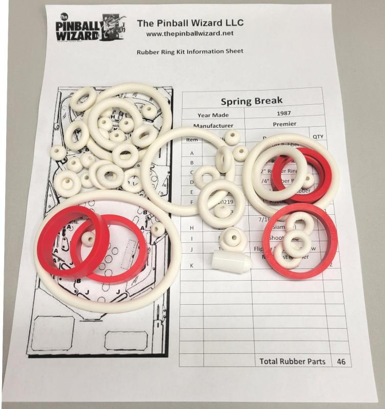 Rubber ring kit for a 1987 Gottlieb / Premier Spring Break pinball machineThis kit has a total of 46 rubber partsWhite rubber rings with red flipper rubbers are the factory original colorIncludes rubber ring sizing chart and playfield rubber location diagram