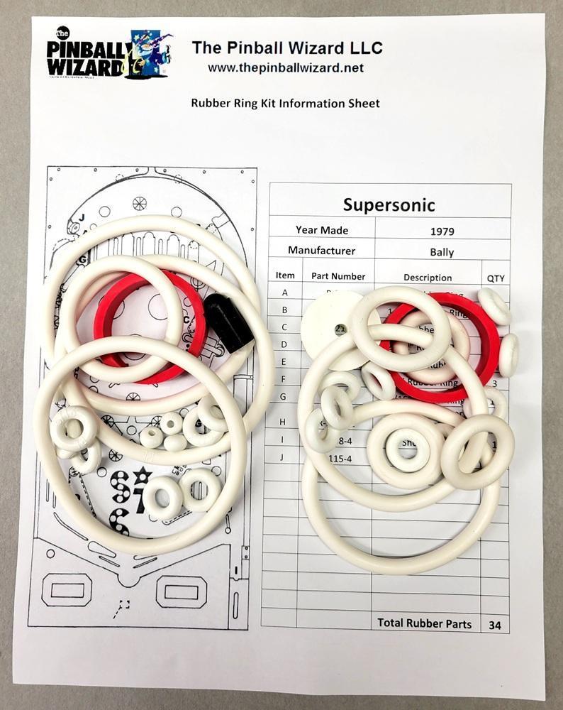 Rubber ring kit for a 1979 Bally Supersonic pinball machineThis kit has a total of 34 rubber partsWhite rubber rings with red flipper rubbers are the factory original colorIncludes rubber ring sizing chart and playfield rubber location diagram