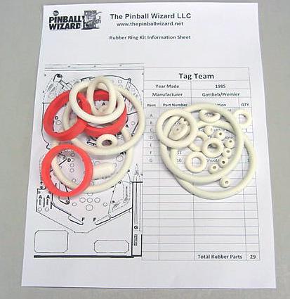 Rubber ring kit for a 1985 Gottlieb-Premier Tag Team pinball machineThis kit has a total of 29 rubber partsWhite rubber rings with red flipper rubbers are the factory original colorIncludes rubber ring sizing chart and playfield rubber location diagram