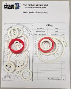 Rubber ring kit for a 1980 Bally Viking pinball machineThis kit has a total of 33 rubber partsWhite rubber rings with red flipper rubbers are the factory original colorIncludes rubber ring sizing chart and playfield rubber location diagram