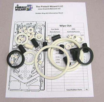 Rubber ring kit for a 1993 Gottlieb-Premier WipeOut pinball machineThis kit has a total of 41 rubber partsWhite rubber rings with black flipper rubbers are the factory original colorIncludes rubber ring sizing chart and playfield rubber location diagram